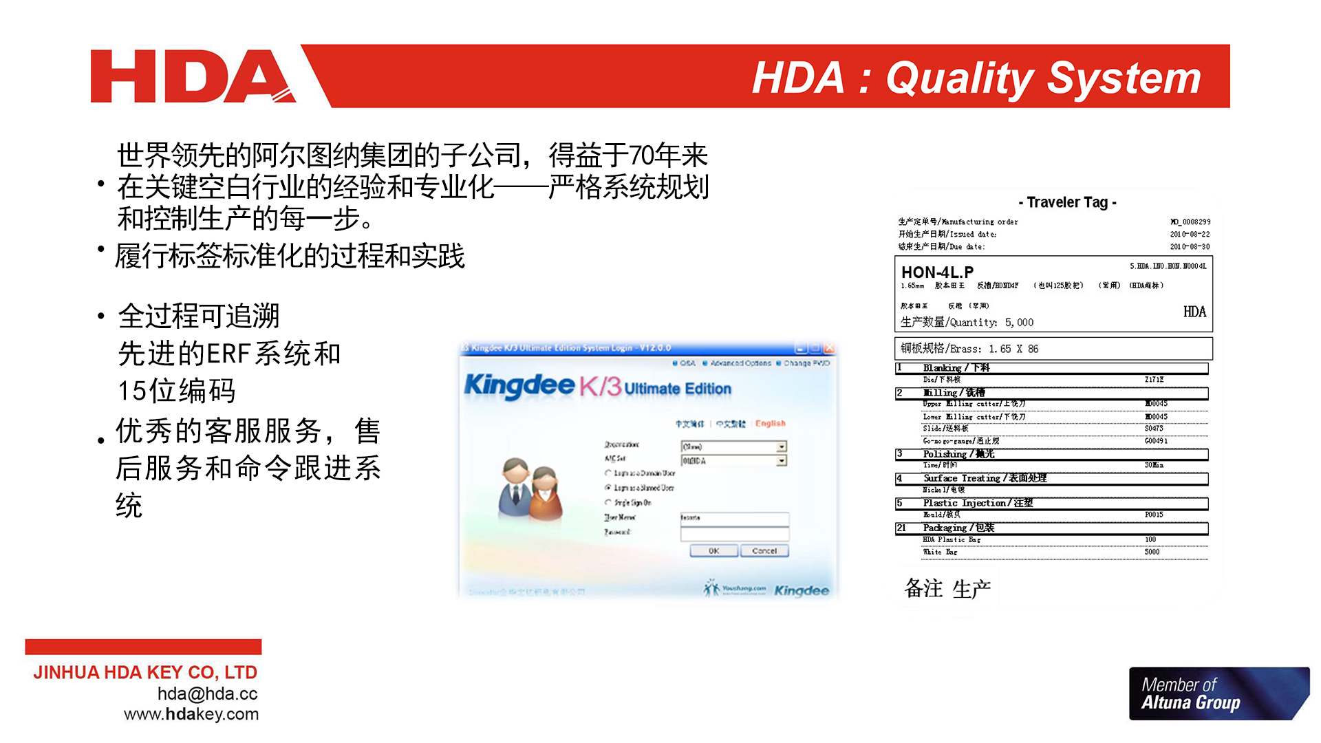 金華宏達鑰匙有限公司(簡稱HDA)位于浙江省金華市經濟開發區。工廠距離上海2小時高鐵車程,毗鄰的義烏小商品城。自90年代初建立以來,HDA已擁有二十多年生產和開發鑰匙的經驗。HDA是一家擁有上萬種原版產品的專業廠家,年產能約兩億條...